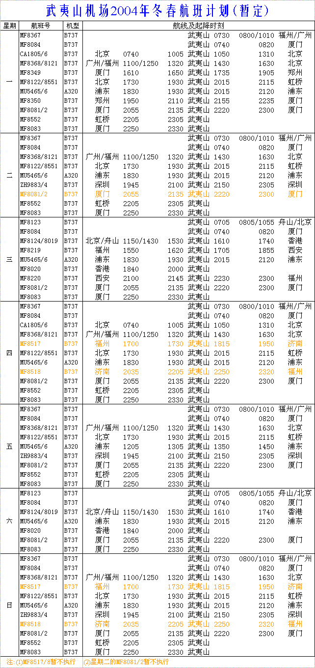武夷山机场2004冬春航班计划