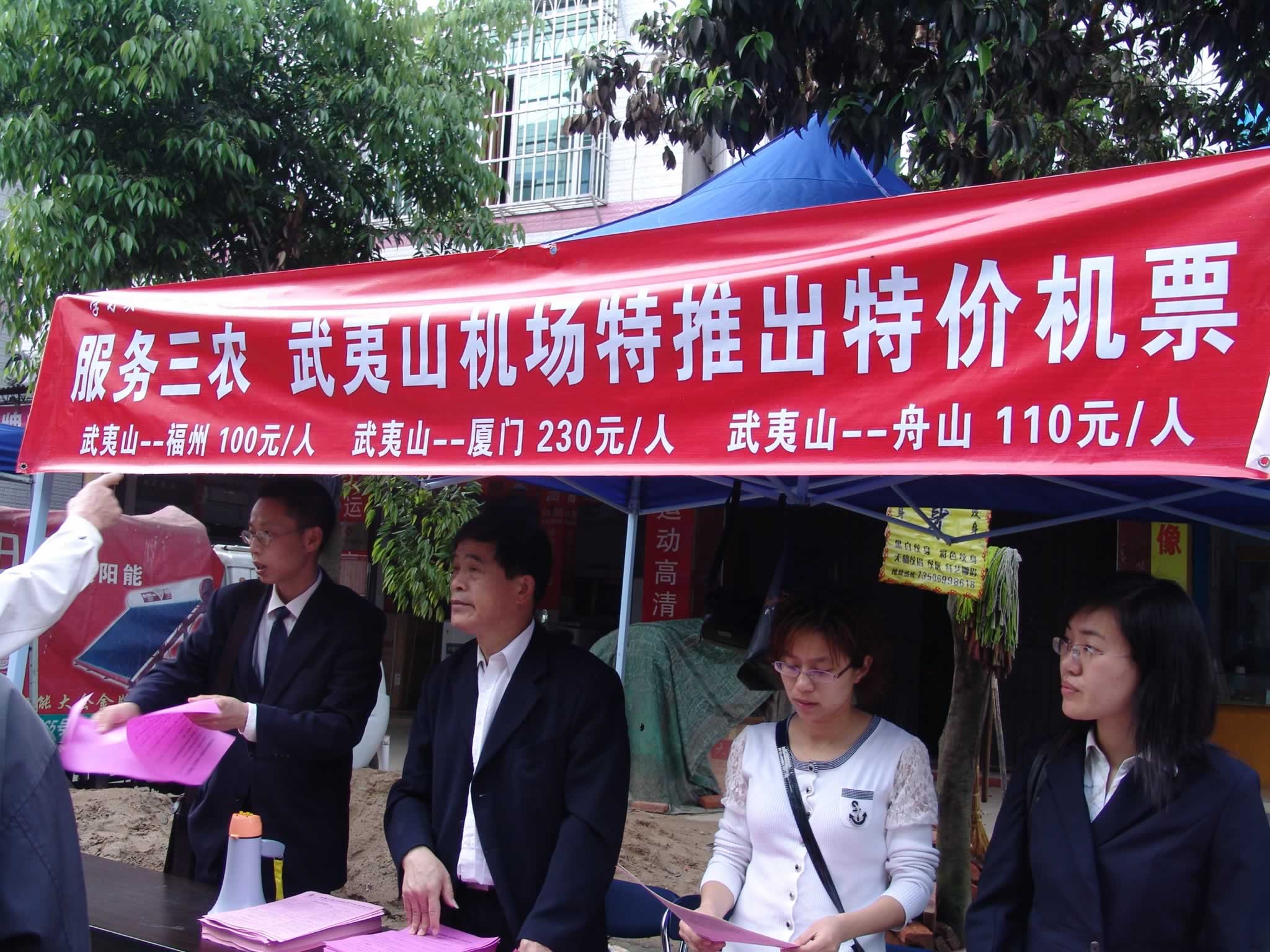在开展学习实践科学发展观活动中,武夷山机场联系实际,紧紧围绕“提升机场竞争力”实践主题,配合国家拉动内需,刺激消费政策,在政府的支持下联手厦门航空有限公司武夷山营业部以及海外旅行社组团中心,让当地农民尝到为其量身定制的“航空旅游大餐”,现场许多村民高兴地说,党和国家惠农政策好,家电下乡、机票下乡,把服务做到家门口,方便我们出行,同时,仅一折的特价机票,又让我们得到实惠。17日至21日在武夷山市五夫镇、岚谷、兴田以及武夷镇现场出票,本次活动共售出机票200多张,受到广大村民的一致好评。(武夷山机场 晋焯豪)