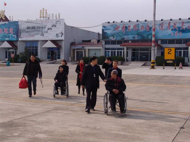 1月17日下午,2009感动中国福建省唯一候选人朱邦月将乘坐MF8121到北京参加评选活动。得知情况后,公司领导高度重视,安排相关部门做好服务保障工作。运输部经理沈浩将朱邦月及其儿子、市文明办汪林、赖建平等陪送人员迎至贵宾室,并与他们亲切交谈。随后,沈经理等人将朱邦月及其儿子送至舷梯,办公室晋焯豪副主任和运输部陈松副经理先将朱邦月扶至座舱,再将其儿子连人带轮椅抬上飞机,并由沈经理亲自抱到座位上,用周到、细致的服务表达了公司对先进模范人物的崇敬和关爱之情。