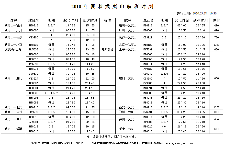 2010夏秋武夷山航班时刻