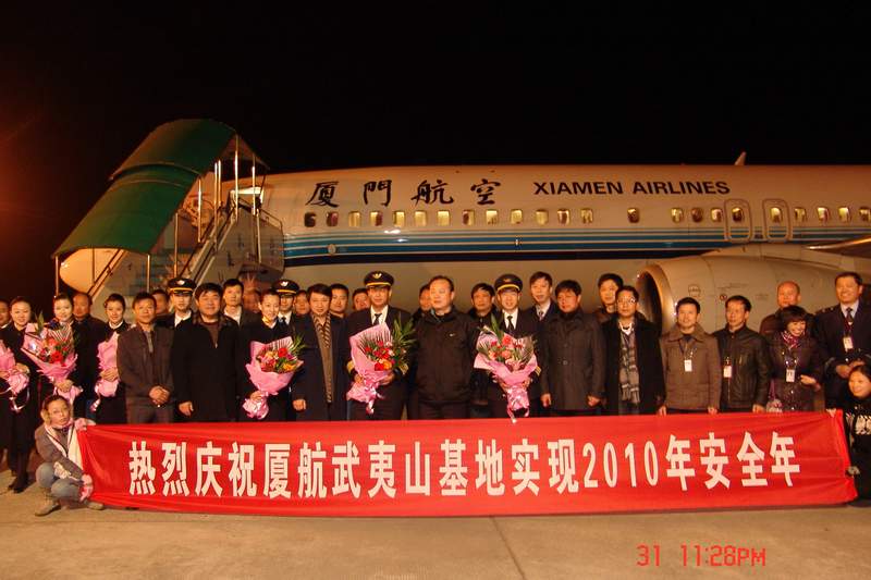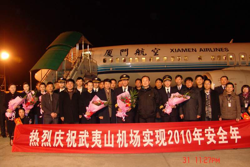 2010年12月31日晚23 时21分 ,香港-厦门-武夷山航班MF8016安全平稳降落在武夷山机场,标志着武夷山机场圆满完成2010年安全生产任务,实现了武夷山机场自通航以来的连续17个安全年,同时也是厦航武夷山基地的第11个安全年。      2010年是武夷山机场极不平凡的一年。“武夷山—厦门”空中快线的成功开通,带动了武夷山机场旅客吞吐量的稳步上升。截至12月31日,武夷山机场共起降航班5740架次,实现旅客吞吐量58.9万人次,创下了通航以来年旅客吞吐量的历史最高记录。  2010年也是武夷山机场风雨同舟的一年。6月19日,特大暴雨袭击武夷山。武夷山机场遭受了98年以来最严重洪涝灾害,机场一度被迫关闭。在危急时刻,公司领导身先士卒,率领广大员工奋力抗洪,取得了抗洪抢险的阶段性胜利,机场在关闭19个小时后顺利开放,率先打开武夷山对外通道。  2010年更是武夷山机场安全品质跃升的一年。这年里,武夷山机场将“安全审计”列为2010年工作的重中之重,机场全体人员为之不懈努力。经过国家民航局为期4天的审计工作,武夷山机场终以99.04%的高符合率顺利通过民航局安全审计,机场安全管理水平迈上了新台阶。  展望充满希望的2011年,武夷山机场将迎接全新的机遇和挑战。随着武夷山—福州、武夷山—北京航线相继加密和武夷山—深圳航线的恢复,武夷山机场旅客吞吐量将从新的起点迈向新的目标。同时,公司将继续巩固安全审计成果,在运行上抓规范,在过程中抓监督,在隐患上抓整改,在制度上抓落实, 进一步提高安全管理水平。新的一年里,武夷山机场将迈着更加坚实的步伐,稳步推进机场改扩建工程顺利进行,全面提升机场服务质量,有力促进机场各项事业持续、健康、快速发展。